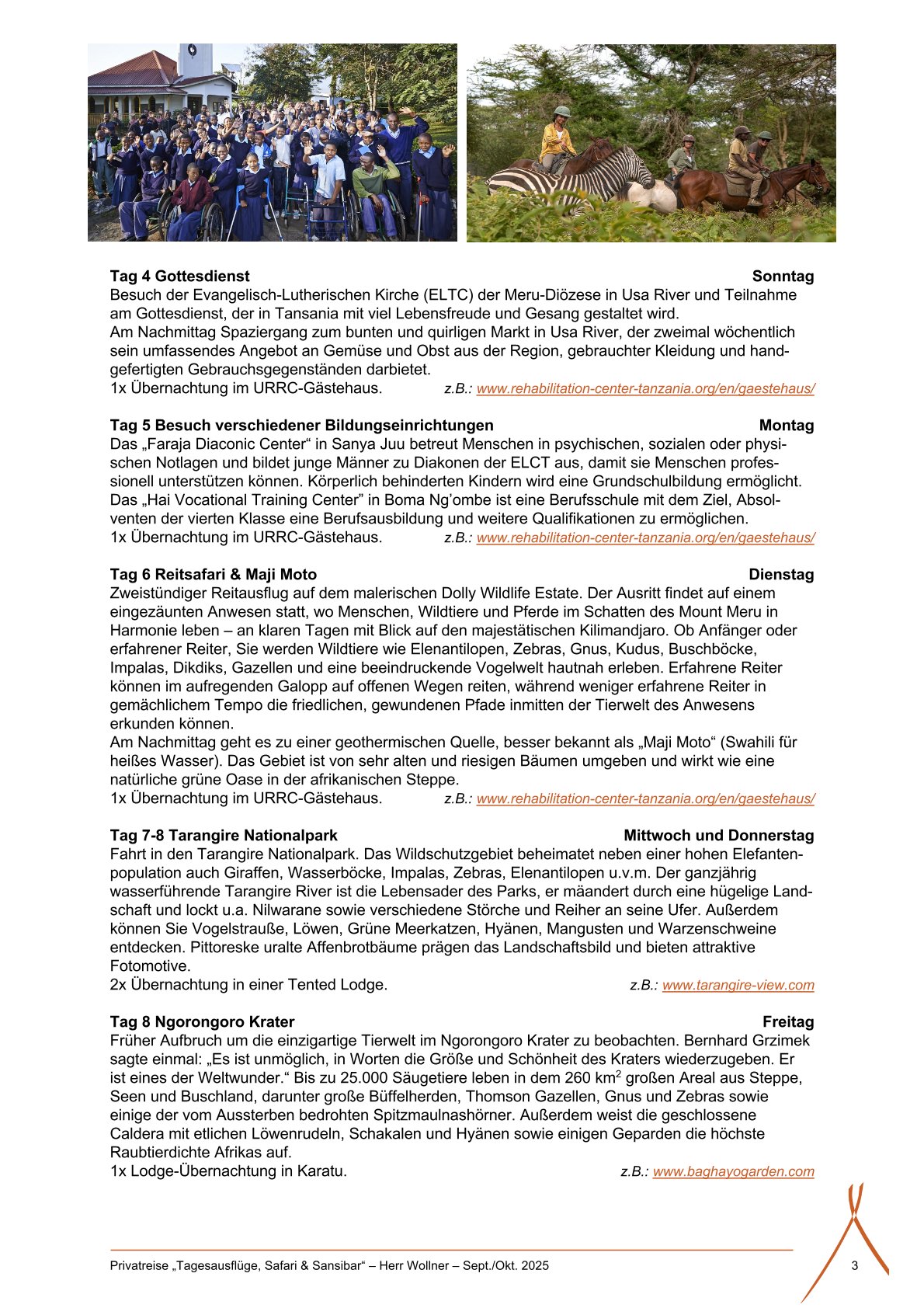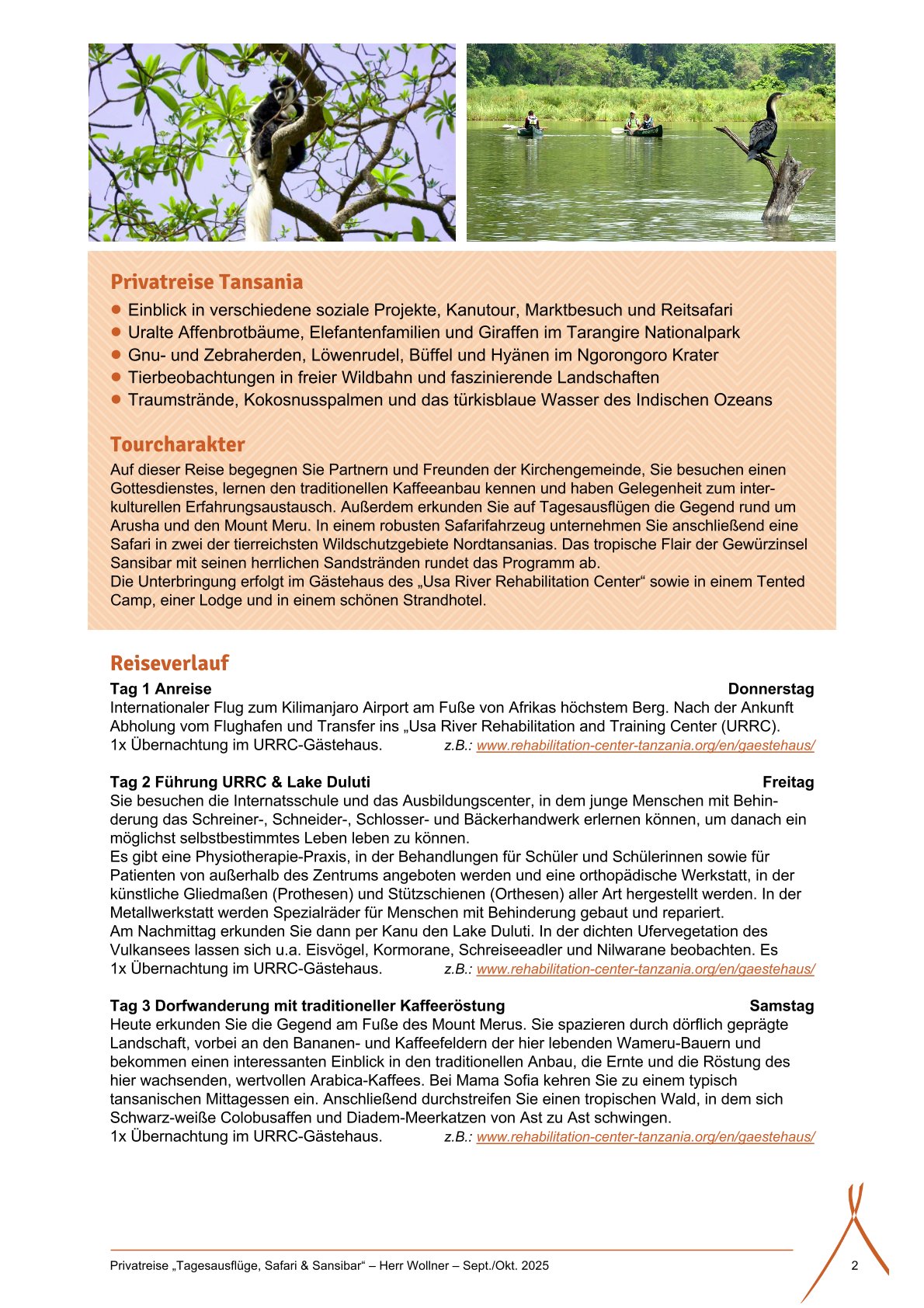 Liebe Tansania-Interessierte, nachdem Richard Hain Ende letzten Jahres eine Reise nach Tansania angekündigt hat, soll diese nun stattfinden. Vorab einige wichtige Informationen dazu: Was erwartet uns: Wir begegnen Partnern und Freunden von MissionEineWelt, der Rummelsberger Brüderschaft und meiner Familie. Wir besuchen Bildungseinrichtungen der Evangelisch Lutherischen Kirche in Tansania. Wir lernen den traditionellen Kaffeeanbau kennen und haben Gelegenheit zum kulturellen Erfahrungsaustausch. Wir erkunden auf Tagesausflügen die Gegend rund um Arusha und den Mount Meru (Reistsafari / Maji Moto) Wir gehen auf Safari und besuchen zwei der tierreichsten Wildschutzgebiete Nordtansanias (Tarangiere & Ngorongoro). Wir tauchen ein in den tropischen Flair der Gewürzinsel Sansibar mit seinen herrlichen Sandstränden. Hinweis zu den Reisekosten: Die genauen Kosten können erst nach Festlegung der endgültigen Teilnehmerzahl bestimmt werden. Zur Orientierung gelten folgende Richtwerte (pro Person im Doppelzimmer mit Verpflegung): Bei 10 Teilnehmenden: ca. 2.490 EUR Bei 12 Teilnehmenden: ca. 2.370 EUR Einzelzimmerzuschlag: 420 EUR Zusätzlich: 7 Nächte im Usa River Rehabilitation Center Doppelzimmer 60 USD pro Nacht Einzelzimmer 35 USD pro Nacht Frühstück 7 USD Abendessen 10 USD Der Flug kostet zwischen 900 EUR und 1.100 EUR (Alle Angaben sind unverbindlich und vorbehaltlich möglicher Änderungen) Teilnehmerzahl: Mindestens 10 maximal 15 Personen.